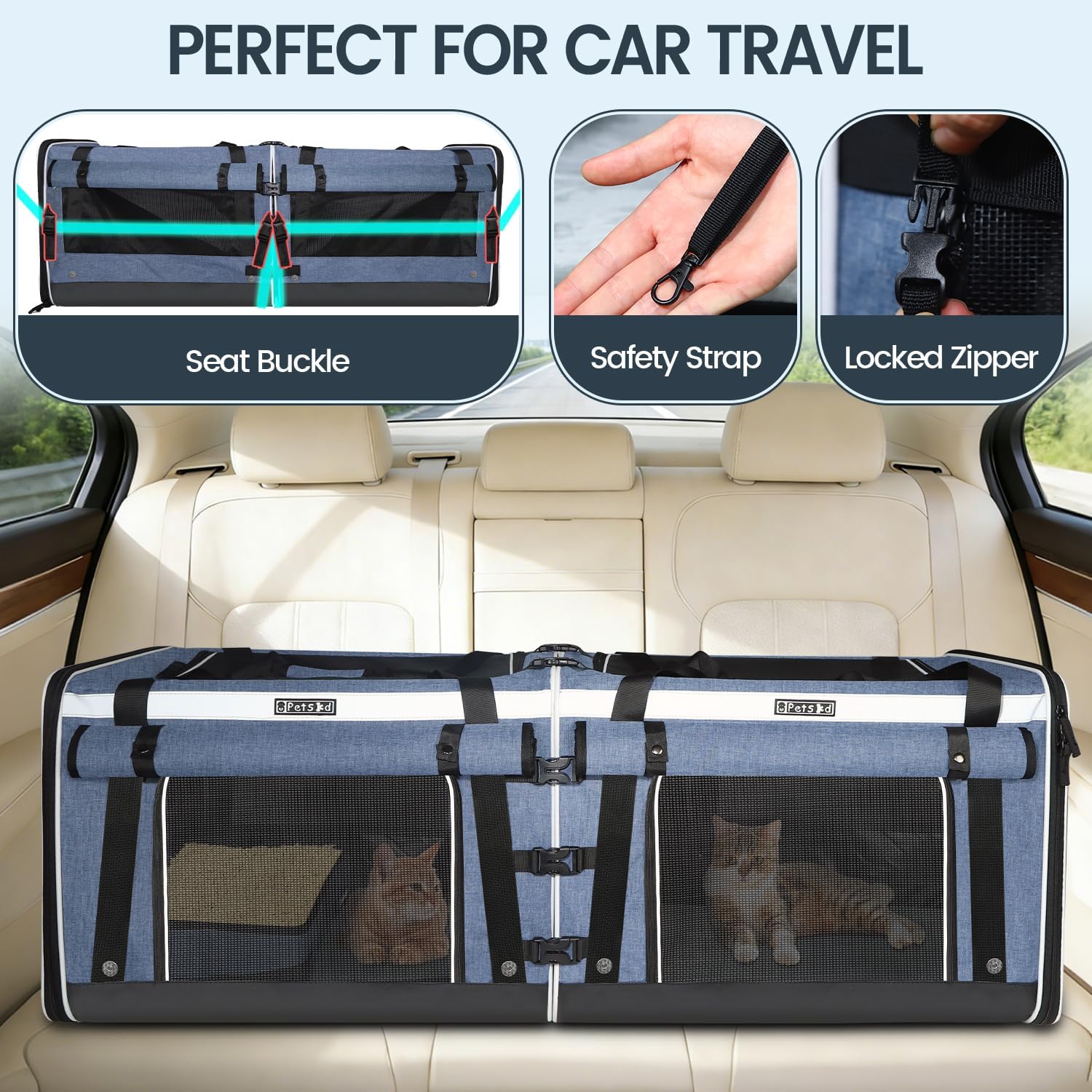 【SAFE DESIGN】Cat car travel carrier upgraded structural design of stainless steel and Fiber rod that makes our cat carrier for 2 cats will not be out of shape or sagged. Built-in adjustable safety rope buckle, easy to lock the collar. Customized Lock Zippers prevent pets from opening the doors. The anti-grab mesh provides double security.